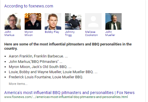Re-iterating the process, Bob goes back to Google and searches for “famous BBQ people”. Google returns an Answer Box right at the top of the results, with a bulleted list of other personalities and public figures in the world of barbecue. Bob can now target the fans of several these public figures.