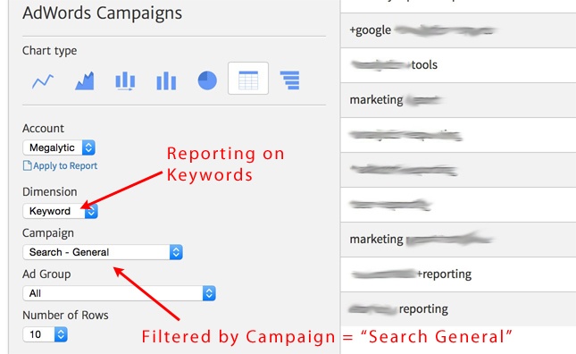 When you select one of the other dimensions, you will have the opportunity to filter that dimension by Campaign and Ad group. For example, below, we have selected the Keyword dimension, and filtered by the “Search – General” campaign. This configures the widget to report Keyword data for the single campaign “Search – General.” Under “Chart type,” we have selected “Table” to display the keyword data in a tabular format.