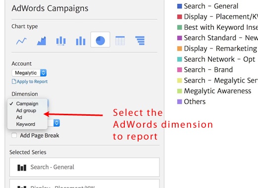 Megalytic’s new AdWords integration enables analysts and marketers to provide detailed reporting on AdWords campaign performance. Beyond just aggregate numbers, Megalytics enables you to drill down and report on individual Campaigns, Ad groups, Ads and sets of Keywords.