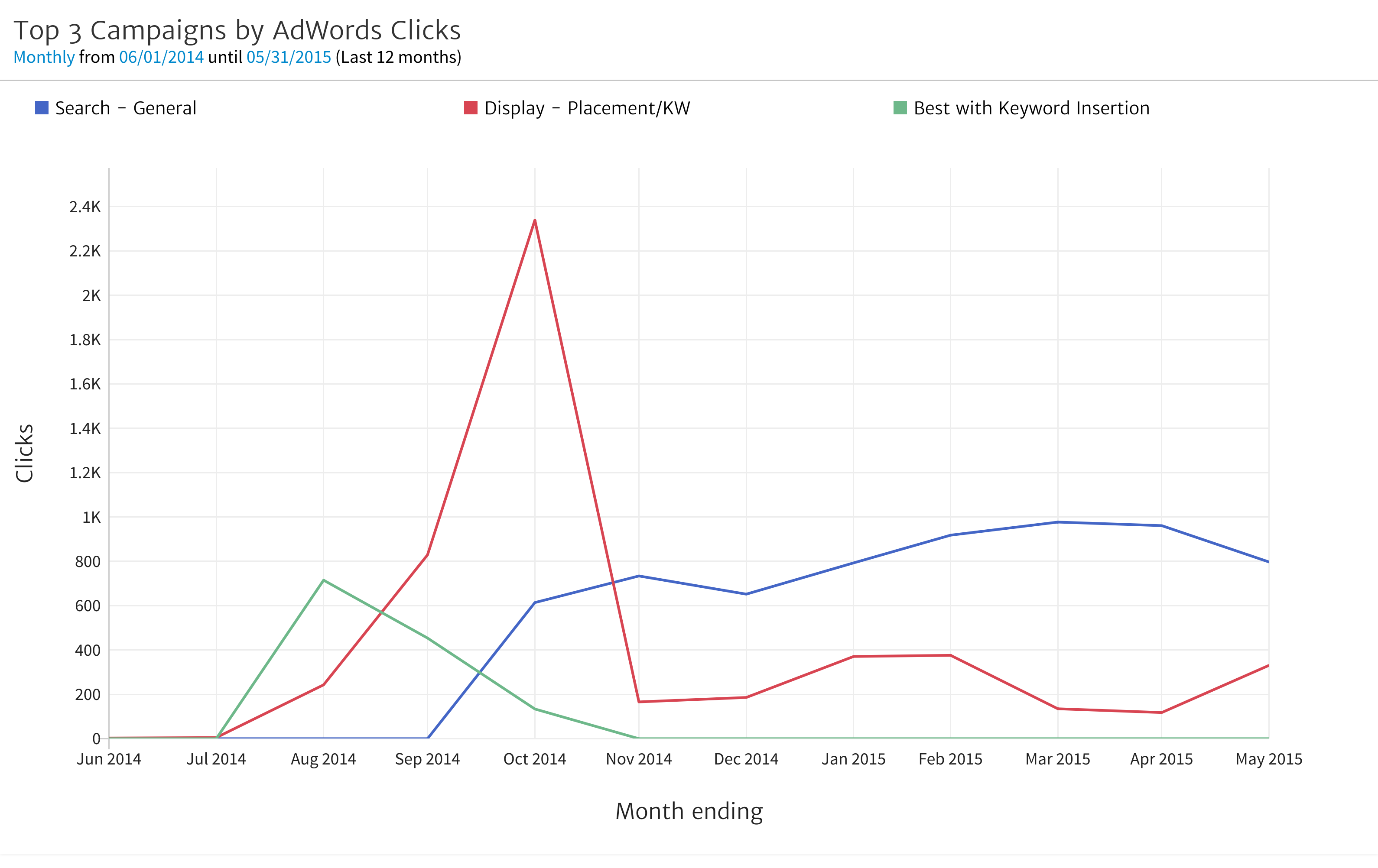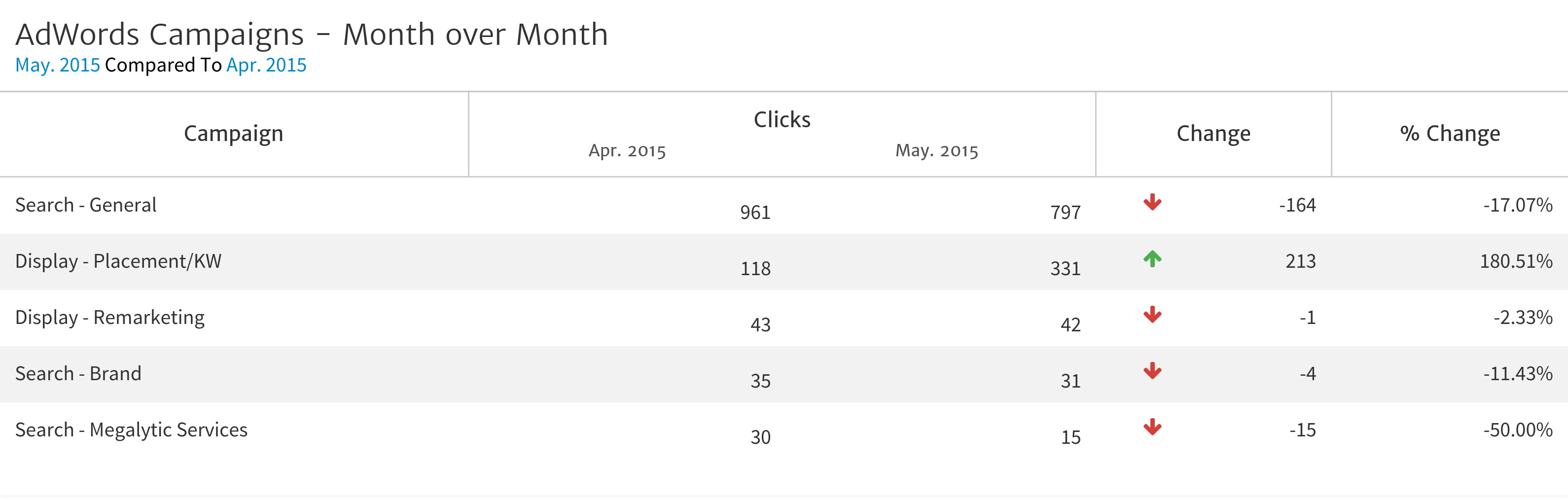 Like most Megalytic widgets, the AdWords widgets can be used to compare performance across time periods to create charts and tables that display month-over-month or year-over-year performance.