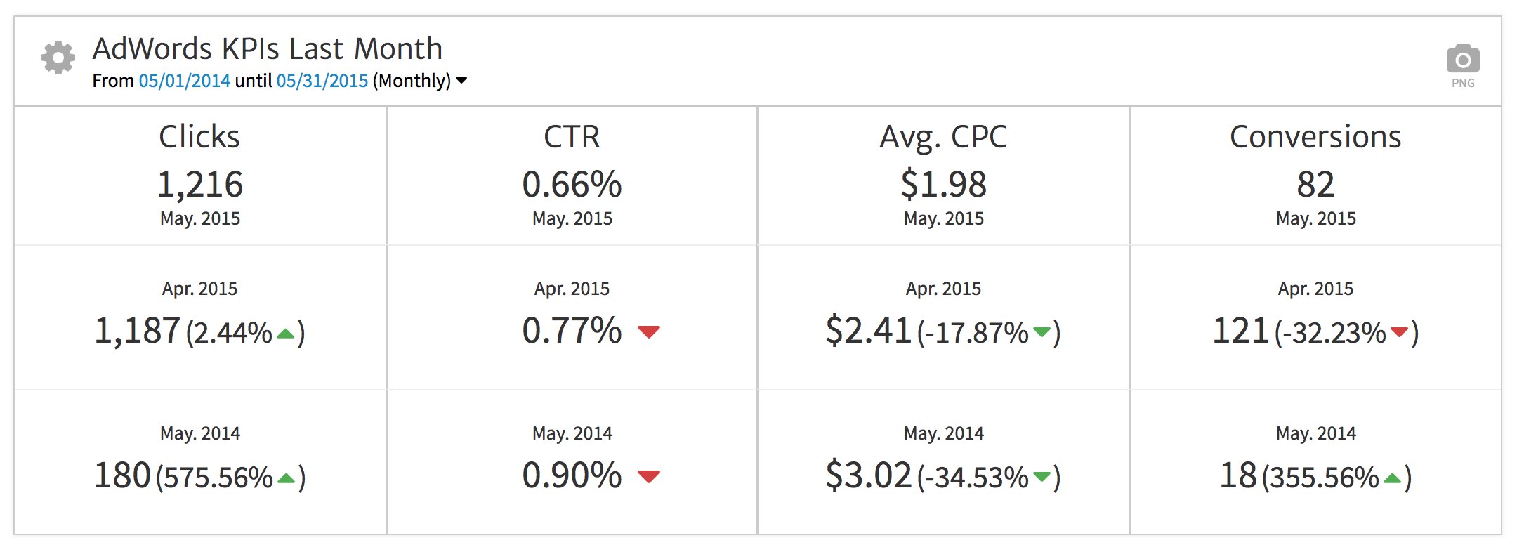 The top row displays the KPIs for last month, while the middle and bottom rows show comparative values for the previous month and the same month last year. In the example below, for instance, you can see that Clicks are up 2.44% from last month, and 575.56% from the same month last year. Conversions, on the other hand, are down 32.23% from last month, and up 355.56% from last year.