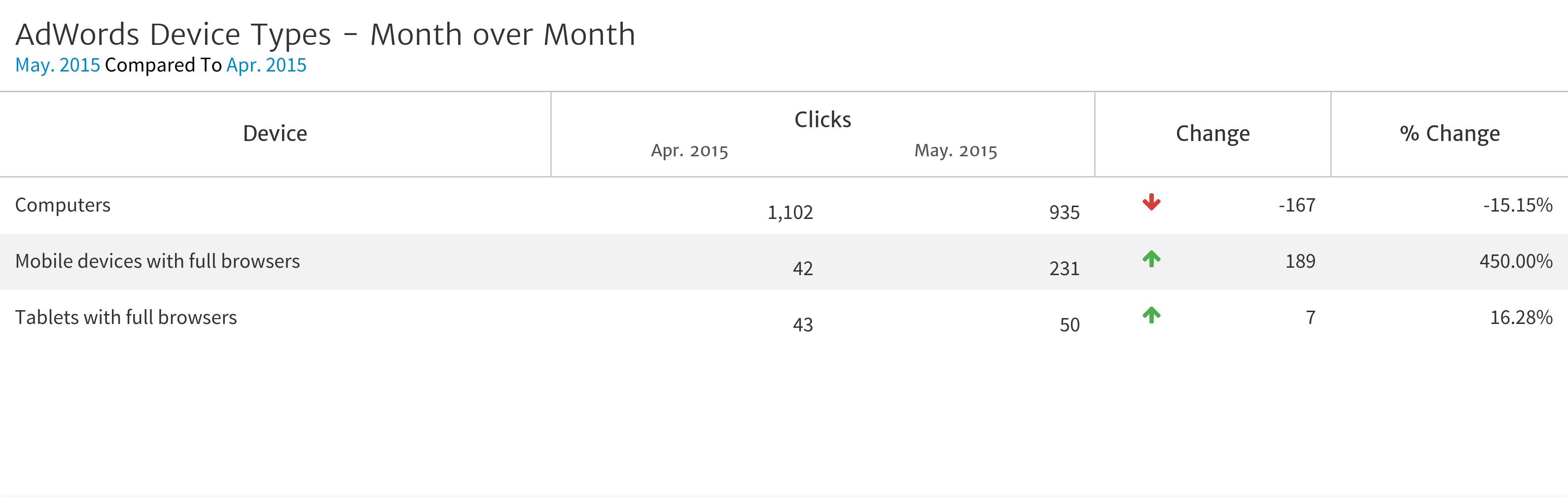 In the example below, you can see that while desktop (Computers) advertising performance declined from April to May, mobile device clickthrough was up 450%.
