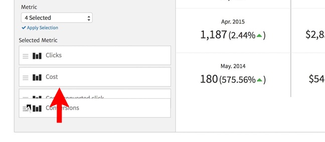 Should you want to use different metrics as your KPIs, Megalytic makes it easy to change the defaults. Suppose, for example, that rather than CTR and Avg. CPC, you need to show the total Cost (AdWords Spend) and the Cost per Conversion. To make this change, open the Widget Editor by clicking on the gear in the upper left corner. Then, scroll down to the Metric selector, uncheck CTR and Avg. CPC, and check the metrics Cost and Cost / converted clicks. Lastly, click “Apply Selection” to show the newly selected metrics.