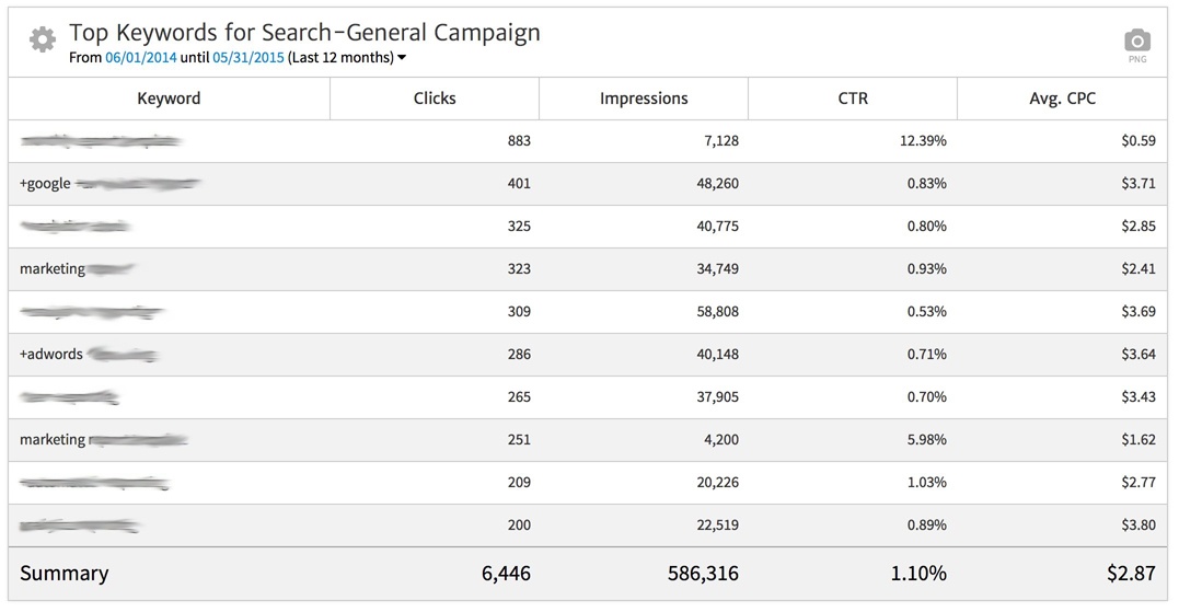 Closing the widget editor, we can now see that this widget is reporting keyword data in a table with columns for: Clicks, Impressions, CTR and Avg. CPC. As with the Multi-KPI widget discussed above, these default columns can be changed using the selector inside the widget editor.