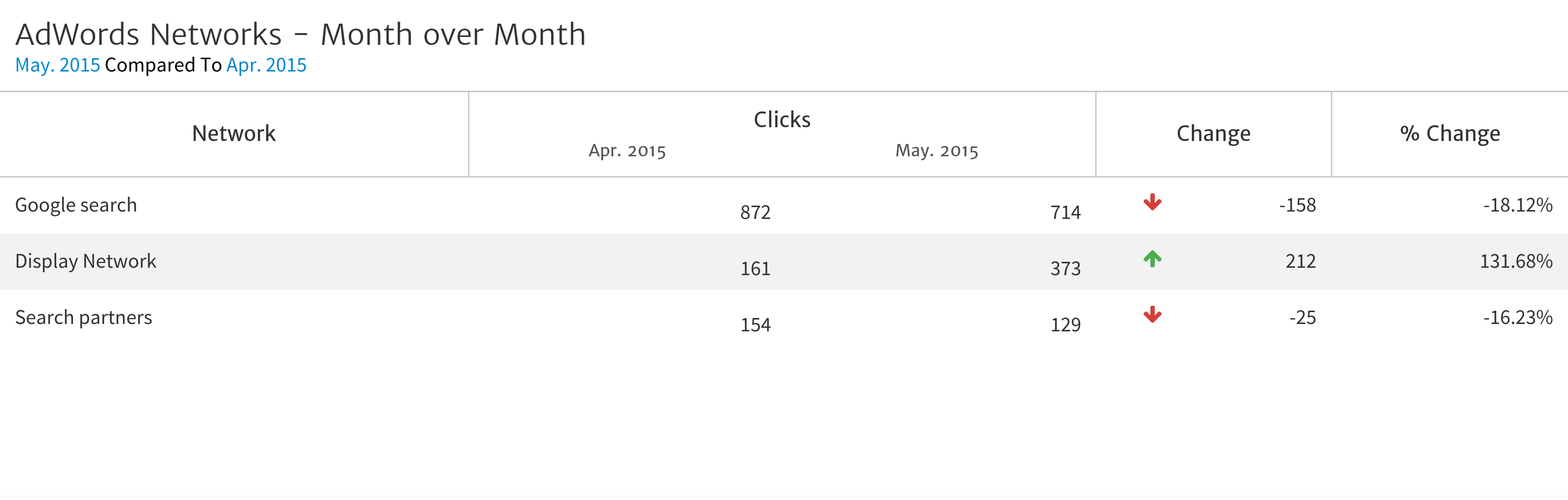 You can use this widget, for example, to show the month-over-month performance of your AdWords campaigns across the different Google advertising networks. In the sample report generated when you created your account, you will find this table near the end. In this case, it shows that while traffic from the paid search networks declined from April to May, traffic from the display network increased dramatically–by over 130%.