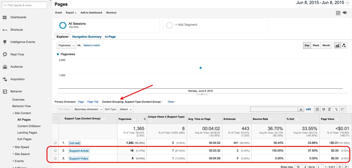 We give our new Content Group tags in GTM a little time (6 – 12 hours) for data to start showing up in Google Analytics. Then, go to the Pages standard report (Behavior > Site Content > All Pages). Select the Content Group “Support Type” from the Primary Dimension selector directly above the table.