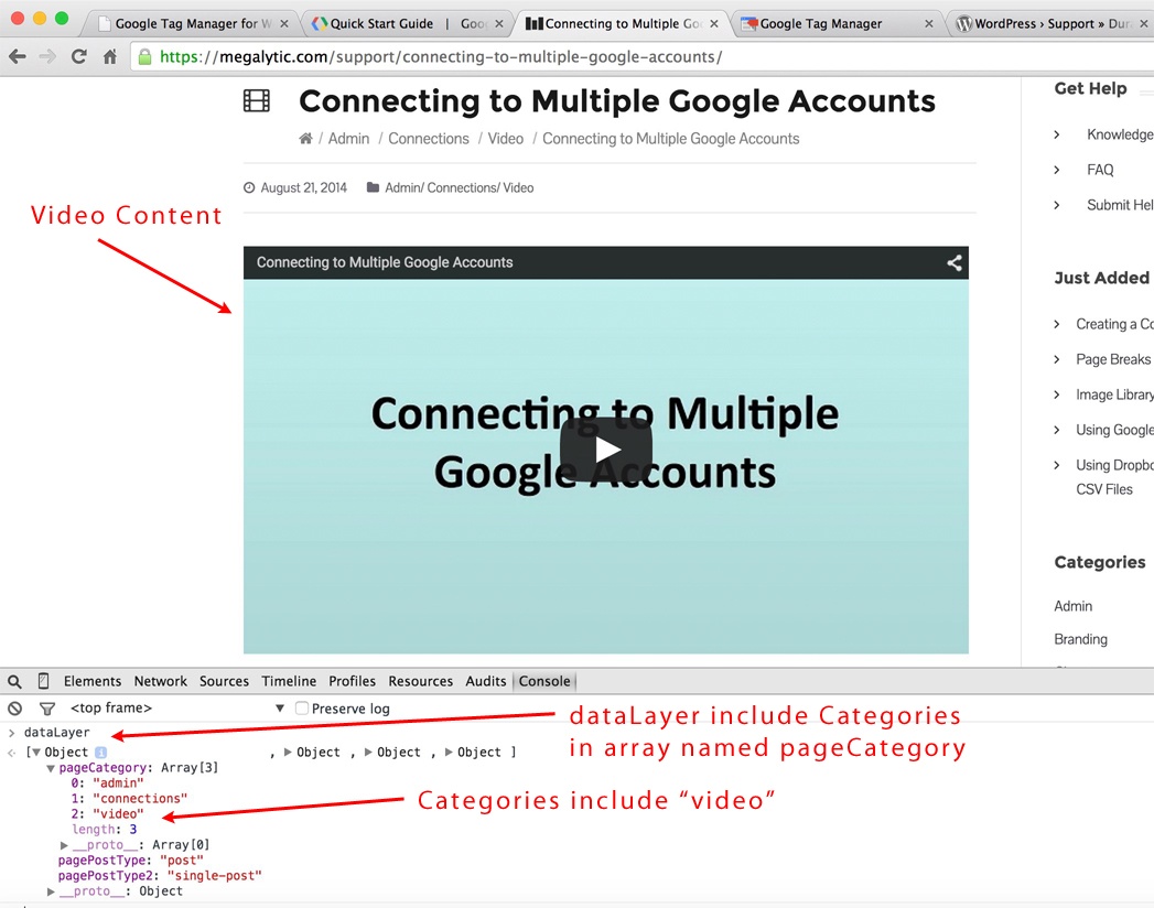 In the image below, you can see that for some video content, the categories stored in the data layer include “video”. In fact, as you can see below, all the categories, defined for the page in WordPress, are not stored in the dataLayer.pageCategory array.