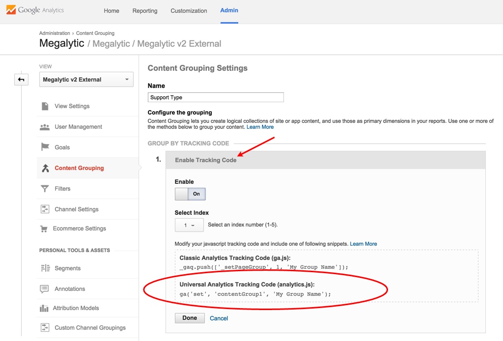 The first step in setting up Content Grouping is to go into the Admin section of the Google Analytics account where you want to track progress. Click on “Content Grouping” and then select “Group by Tracking Code.” We’ll be using this group to track the type of Support page viewed by the user, so we’ll name this Content Group “Support Type.”