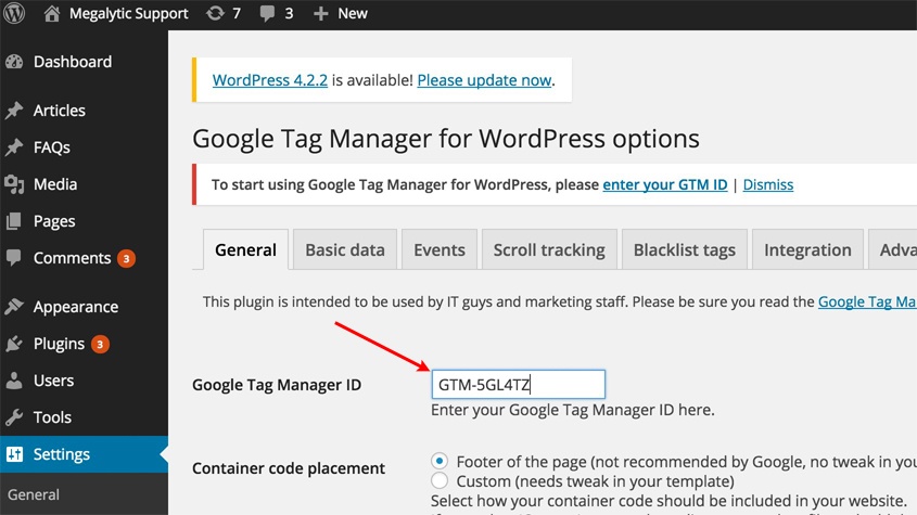 Once installed, you’ll need to enter your Google Tag Manager ID. We recommend creating a new GTM account for your WordPress site to use with this plugin. Once your GTM account is set up, enter the GTM ID in the plugin.