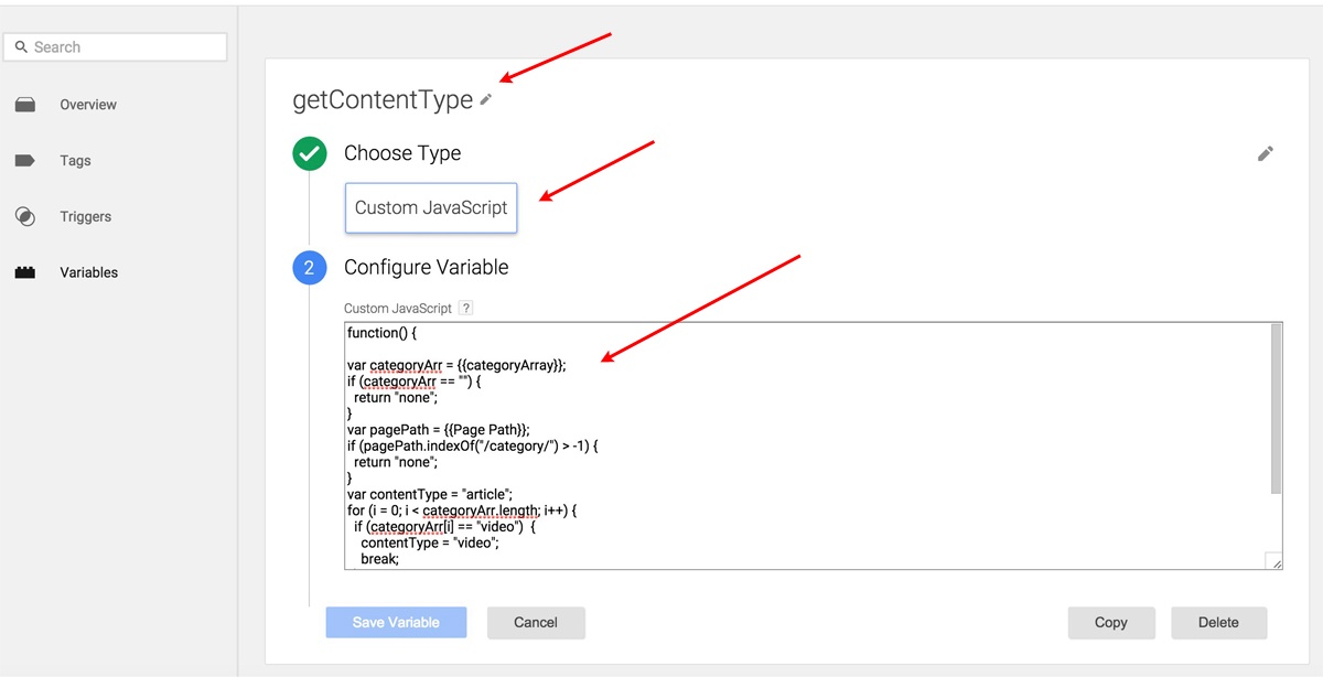 This code simply scans the array from looking for “video.” To put this code to work inside of GTM, we create a Custom JavaScript variable similar to how we created the data layer variable. After clicking on “Variable” and “New,” then populate the fields by naming the variable “getContentType,” selecting “Custom JavaScript” as the variable type, and inserting the code that calculates the content type.
