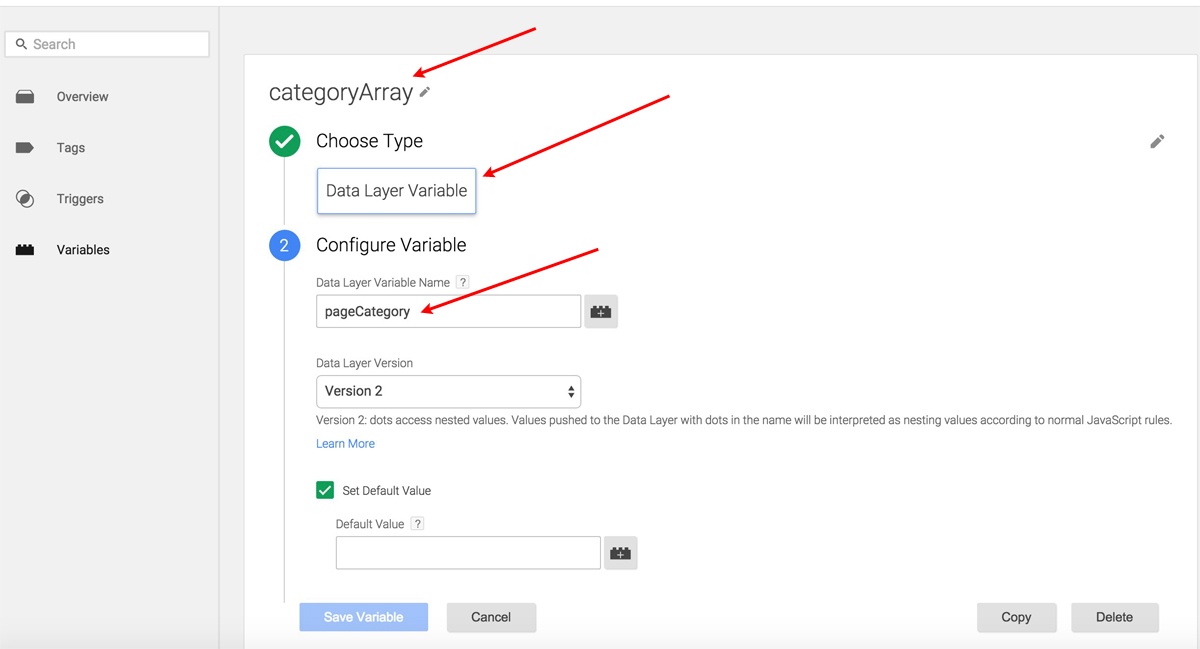 We give the new variable the name “categoryArray,” since it holds the array of categories. We select the type “Data Layer Variable,” and populate it with the data from the data layer variable pageCategory that the plugin has recorded.