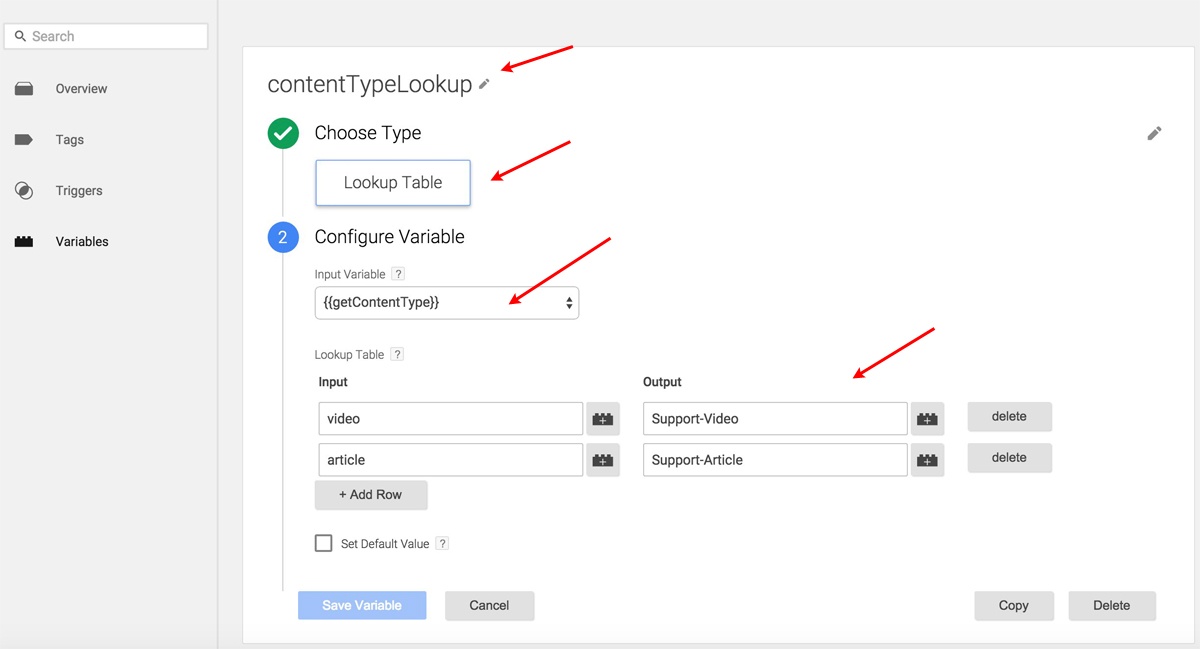 In addition, we add rows to the Lookup Table to map each possible input value (the return values from ) to a content type. In this case, the mapping is very simple – “video” is mapped to “Support-Video” and “article” is mapped to “Support-Article.”