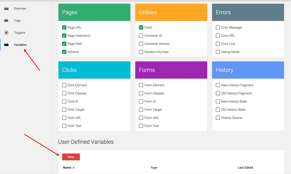 So, we need to be able to access the pageCategory array from inside GTM. To do that, we create a “Data Layer Variable” inside of GTM that will hold the value of pageCategory. Start by selecting “Variables” on left rail of GTM, scrolling down to “User-Defined Variables” and clicking “New.”