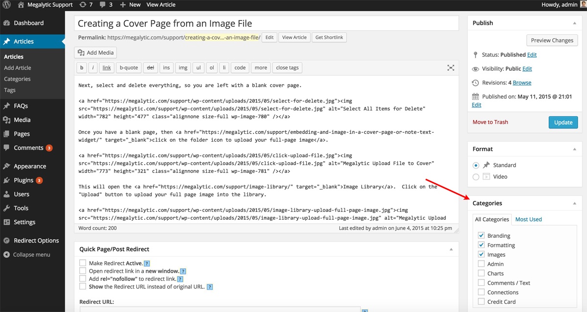 In the above image, you can see that the post type being edited here supports categories. We also see that this particular post has been categorized with “Branding,” “Formatting,” and “Images.” A simple Content Grouping can be created using the category attribute, where we can group all content as either a Video (if the Category of “Video” has been selected), or an Article if the “Video” category does not apply.