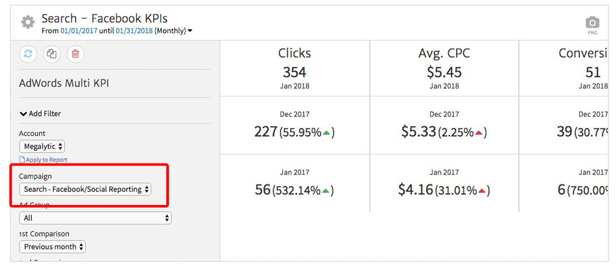 In addition to account level KPIs, your client may also want to see KPIs at the campaign level. To do this, you can use the same Multi-KPI widget, but with a specific campaign selected.