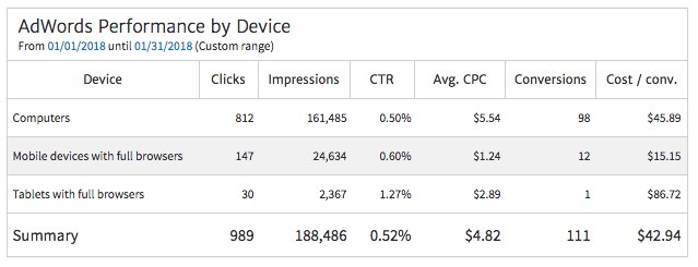 Lastly, you should include some data showing the relative performance of your client's ads across devices. While mobile grabs an increasing share of overall traffic, that doesn't necessarily mean that mobile is the most important device category for your client's ads. That's going to depend on your client's product and how the client's customers like to engage.