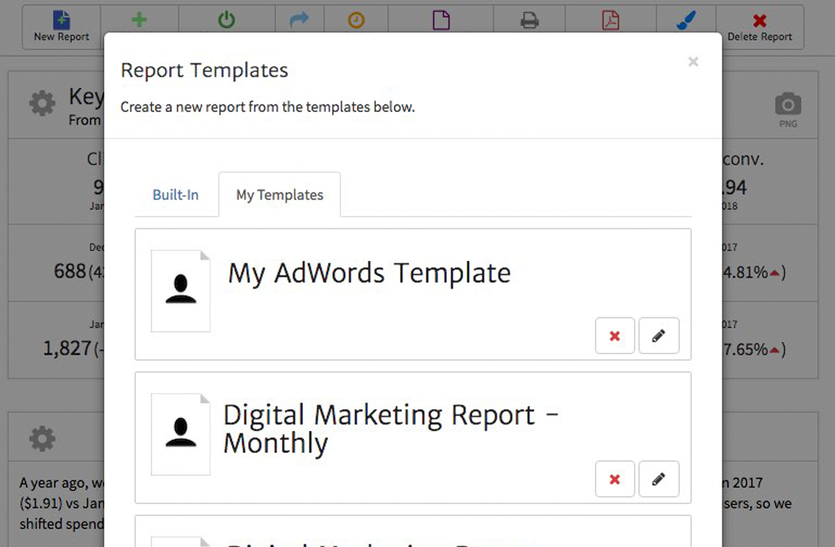 To use an existing template, create a new report and select the My Templates tab. You’ll then see a list of your custom-built templates where you can choose the one you wish to use. The one we just created is shown below as "My AdWords Template".