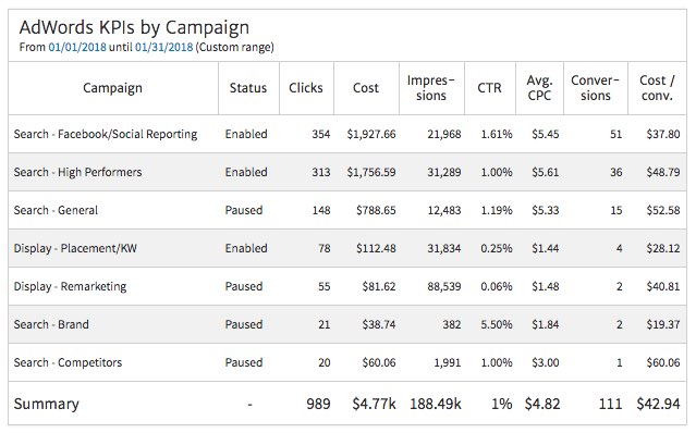 Rounding out the KPI section of your report, many clients like to see a summary of the KPIs for all the campaigns. In this type of table, you may also want to include a column showing the Status (i.e., Enabled, Paused, Stopped) for each campaign, so the client can tell which ones are currently running.