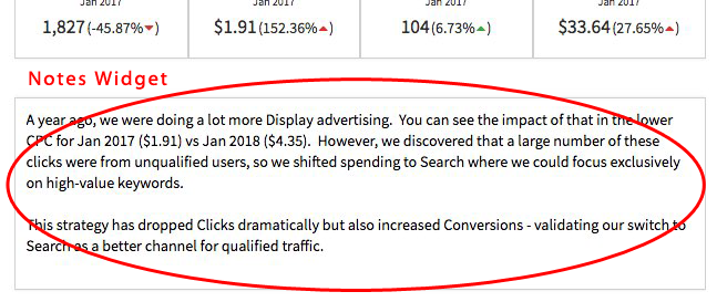 It's a good idea to meet with your client each month to review the performance of their Google Ads account. Their report, however, should be delivered prior to the meeting. To help your client understand the trends and strategy behind the numbers being reported, you can include text annotations in your report. Megalytic provides the Notes Widget for this purpose. Here is a note being used to explain the KPI widget example above.
