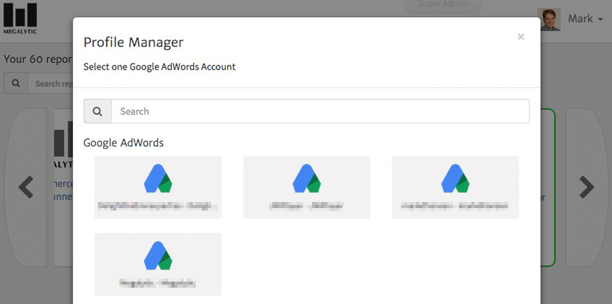 After you select the template, the next step is to choose the Google Ads account for generating the report. Megalytic will show you all the Google Ads accounts you have connected. Pick one, and the template will be populated with data from that account to create the report.