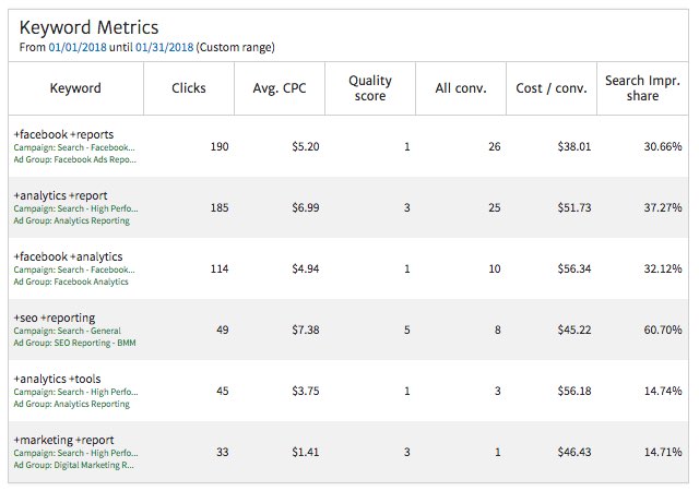 Along with Clicks, its a good idea to provide a selection of other important metrics. Here, we have selected Avg. CPC, Quality Score, All conv. (conversions), Cost / conv., and Search Impr. share. Notice that the Keyword column also includes (optionally) the Campaign and Ad Group information.