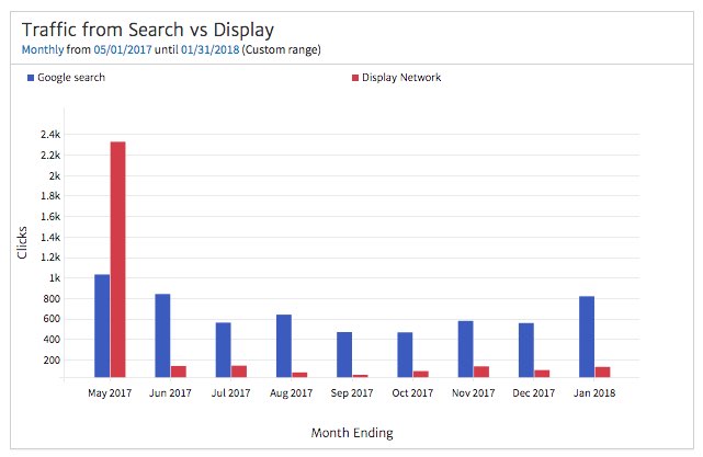 If you are doing both Search and Display Network advertising for your client, it makes sense to provide a summary of where the traffic is coming from. Here, we show the monthly trend in Clicks from Search vs Display. You can see that we started out investing more heavily in Display, but over time have shifted focus to the Search Network.