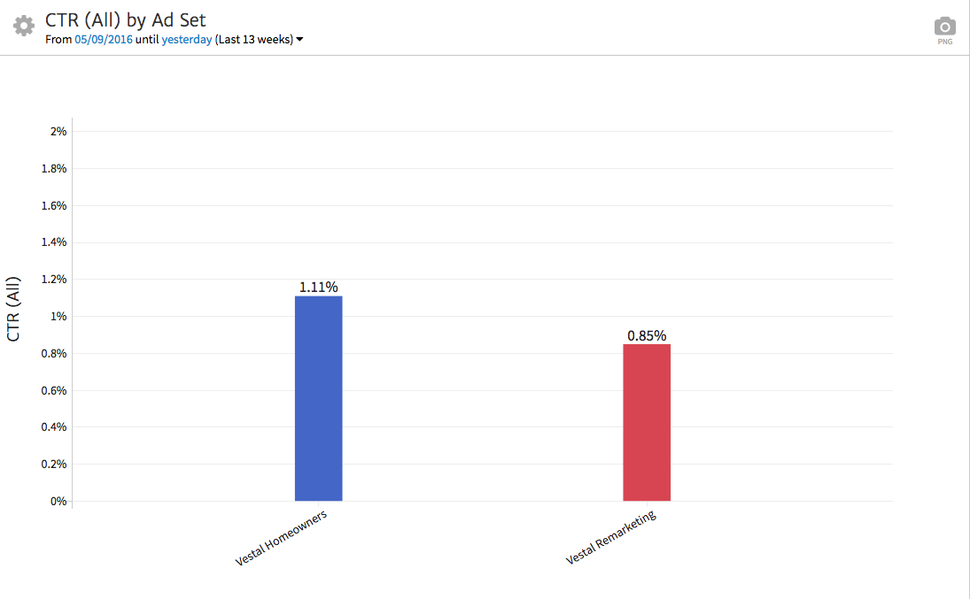 A bar chart will allow you to quickly show performance of multiple ad sets, comparing how effective each set was in generating a response from its intended audience. For instance, in this example, we show CTR (clickthrough rate) by ad set.