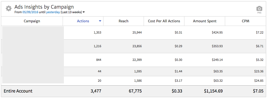In this example, we’ve sorted campaigns by those driving the most Actions, in addition to showing Reach, Cost Per All Actions, Amount Spent, and CPM (cost per thousand impressions). If we want to show other metrics, we can go to the widget options and select the ones we want to include. This customization of this widget is similar to that of the Multi KPI widget.
