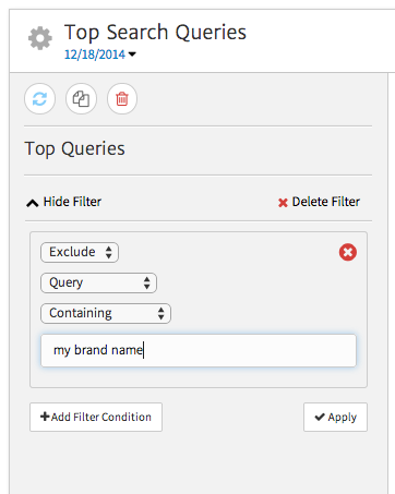 To show this information, add the Top Queries widget and select your client’s Search Console account. You may want to exclude searches for your client’s brand name. To do this, click the gear to customize the widget and select “Show Filter” in the top of the edit area. Set up the filter to exclude mentions of the brand name. You may also need to include variant spellings depending on the volume of searches. Click “Apply” to save the filter and you’ll see a list of your top non-branded search queries.