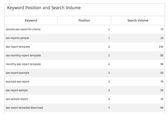 For instance, you may be tracking keyword ranking data in a platform such as SEMrush. You can easily export a spreadsheet of keywords, comb through the list to include the ones most relevant to a client’s business, and upload the resulting file into a CSV widget. A simple CSV import from SEMrush for keyword position and search volume looks like this.
