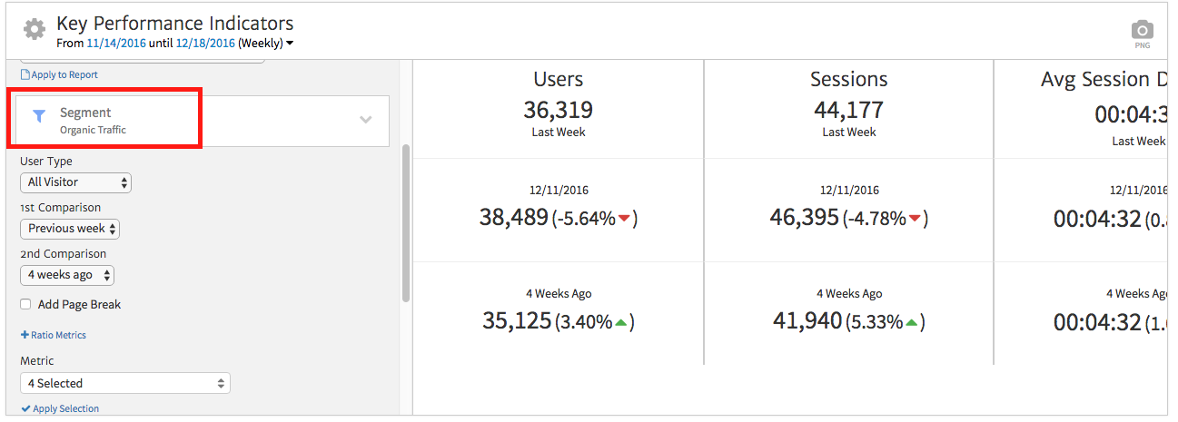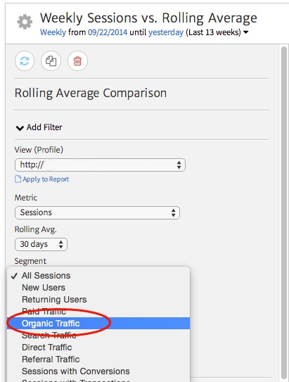 To set up this widget to show only organic sessions, click the top gear to customize the data. Next, select “Organic Traffic” from the Segment dropdown. You’ll then see the final report showing average organic traffic over your chosen time period.