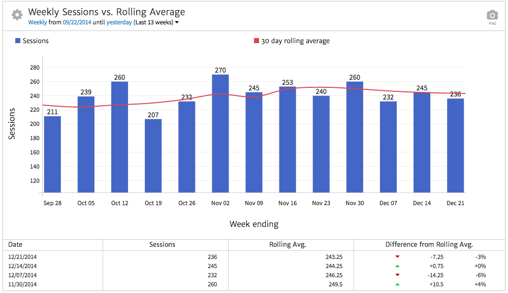The first thing to add to your SEO report template is an overview of organic search performance. Megalytic’s Rolling Average Comparison can compare weekly traffic to a “rolling average” of how traffic has fared over a longer period of time.
