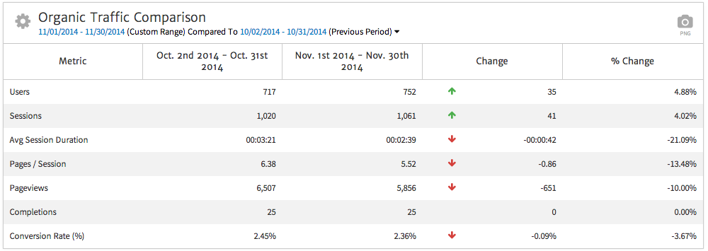 From this data, we can see that while total users and sessions from organic search have increased, the quality of these visits appears to have decreased. Users are spending less time on the site and looking at fewer pages. In addition, while the number of Goal completions has remained steady, conversion rate has decreased slightly.