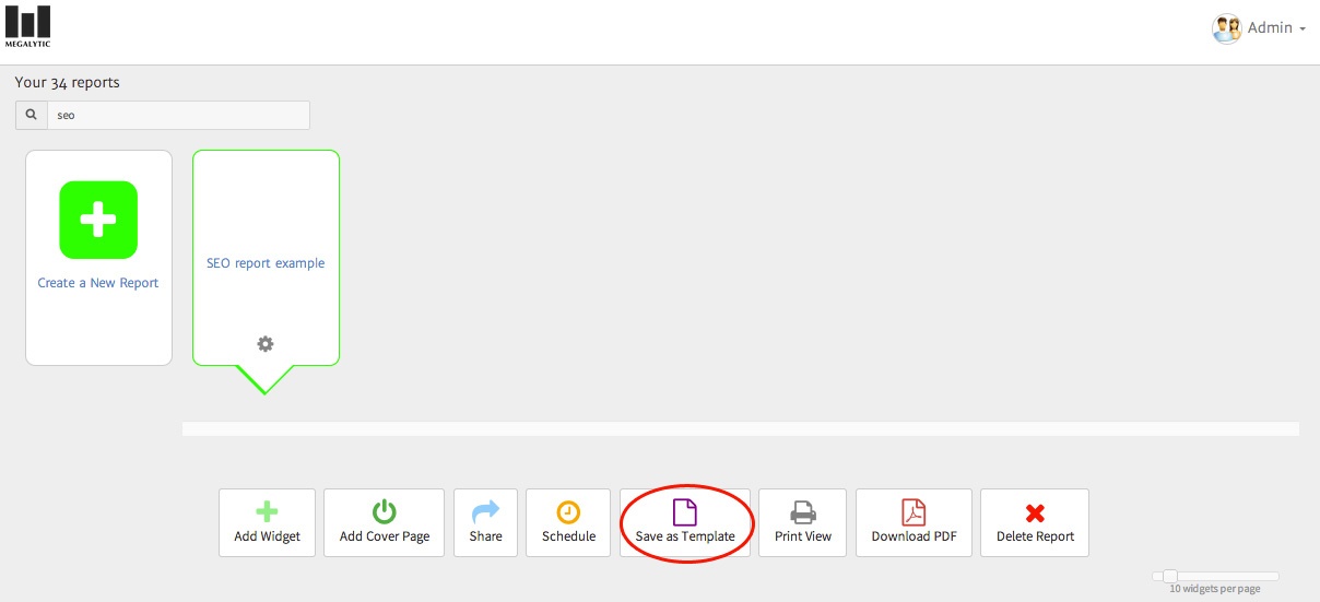 Once you’ve added all the widgets you’d like to include, taking into account showing stats for both a big picture perspective and granular details where necessary, save your template for future use. To do this, simply click the “Save as Template” button right above your report in Megalytic.