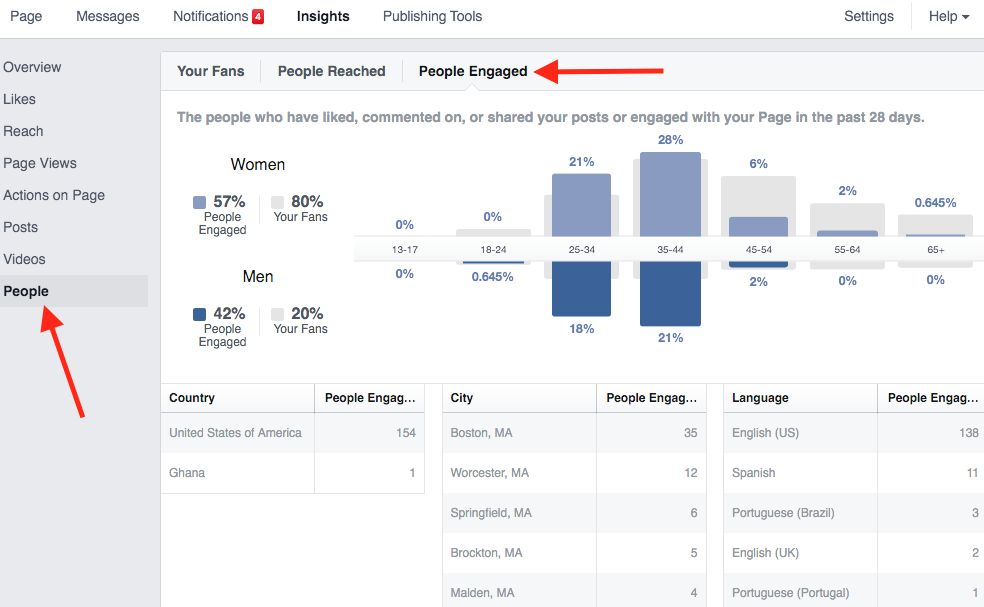 The final tab shows people engaged, measuring demographics for those who chose to interact with your page in some way over the past 28 days. These individuals may have liked, commented on or shared posts, or they may have interacted with your page in other ways, such as by viewing videos.