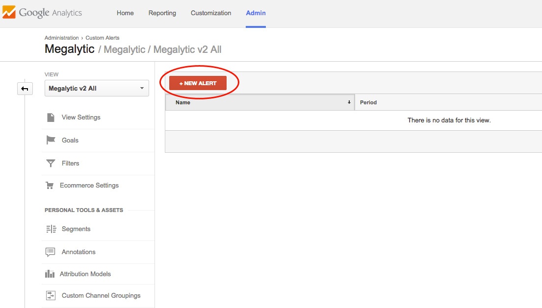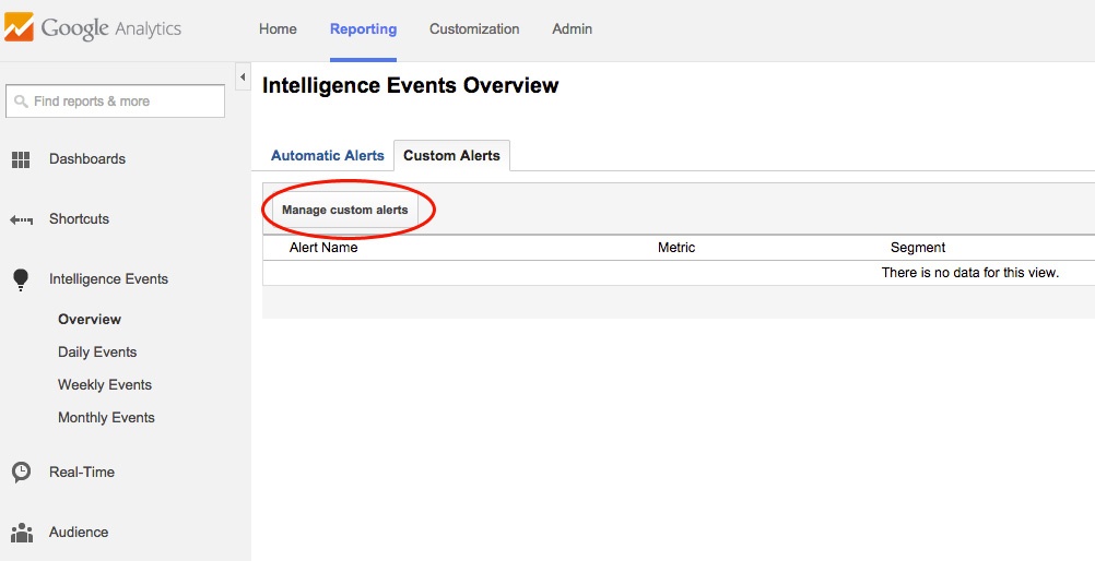 To set up a Custom Alert, go to Intelligence Alerts > Overview from the Reporting section within Google Analytics. Once there, select the Custom Alerts tab and click the “Manage custom alerts” button.