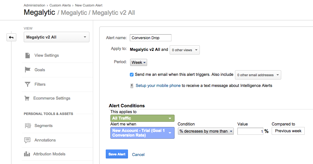Here, you’ll be asked to select the criteria for your alert, specifying the date range and conditions. In this case, we’ve created an alert to notify us if sessions drop more than 10% from the previous week. Other useful alerts could be set to notify about changes in conversion rate or transactions on an ecommerce site.