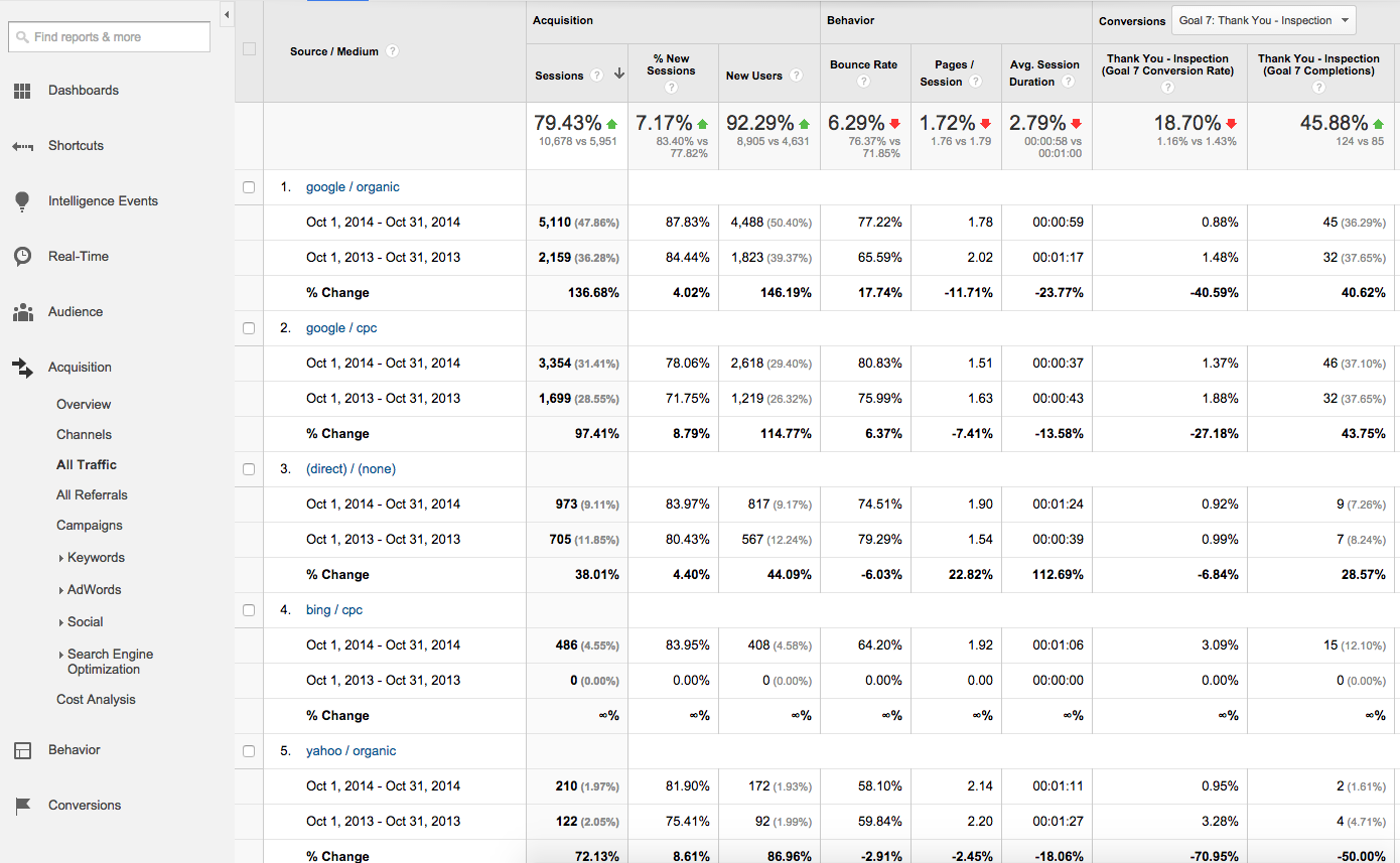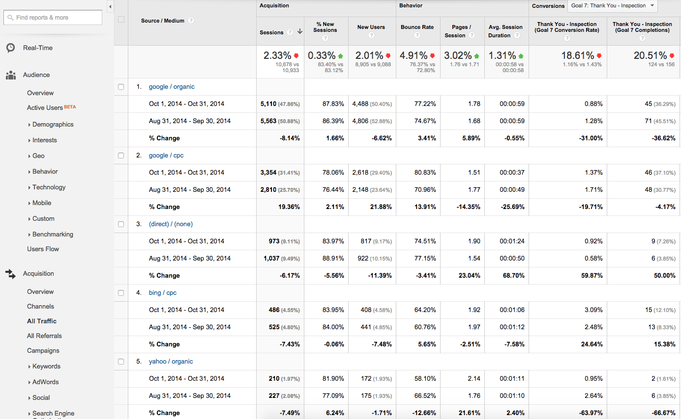 In this example, we noticed a drop in conversions one month compared to the previous month and navigated to the All Traffic report (Acquisition > All Traffic) to find out what source(s) contributed most heavily to the drop.