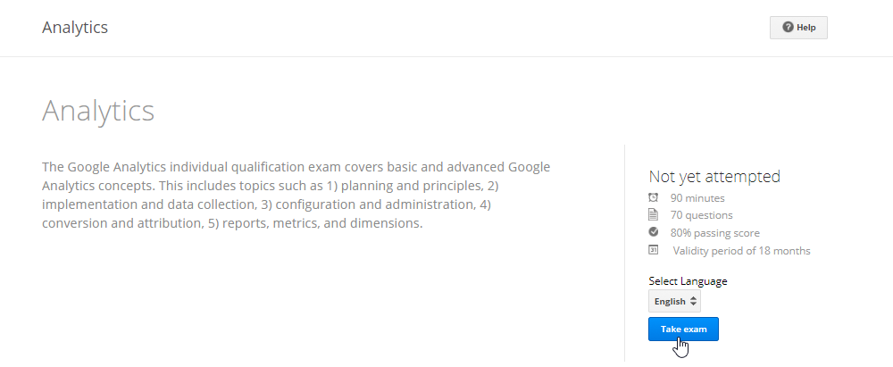 On the next page, you’ll have the opportunity to do one of two things, launch directly into taking the Google Analytics Certification test or study first. The test consists of 70 questions, lasts 90 minutes and requires 80% correct answers to pass. Once you have passed, the certificate is valid for 18 months. Google makes updates to analytics pretty regularly on anything from functionality to interface, which means that 18 months from today there may be new features to test you on.