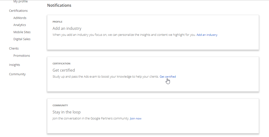 To take the GAIQ exam, start by going to the Google Partners website. If you don’t have an account, you can set one up and once logged in choose the box that says “Get Certified.”