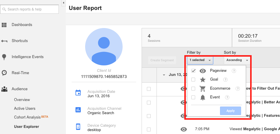 You can filter actions shown in this report using the “Filter by” dropdown in the top bar. This allows you to filter by one or more of the following categories: Pageview, Goal, Ecommerce, and Event. Simply check your desired box(es) and click Apply. Finally, you can use the “Sort by” dropdown to sort actions by time, with Descending showing the most recent actions first and Ascending showing the earliest actions first.