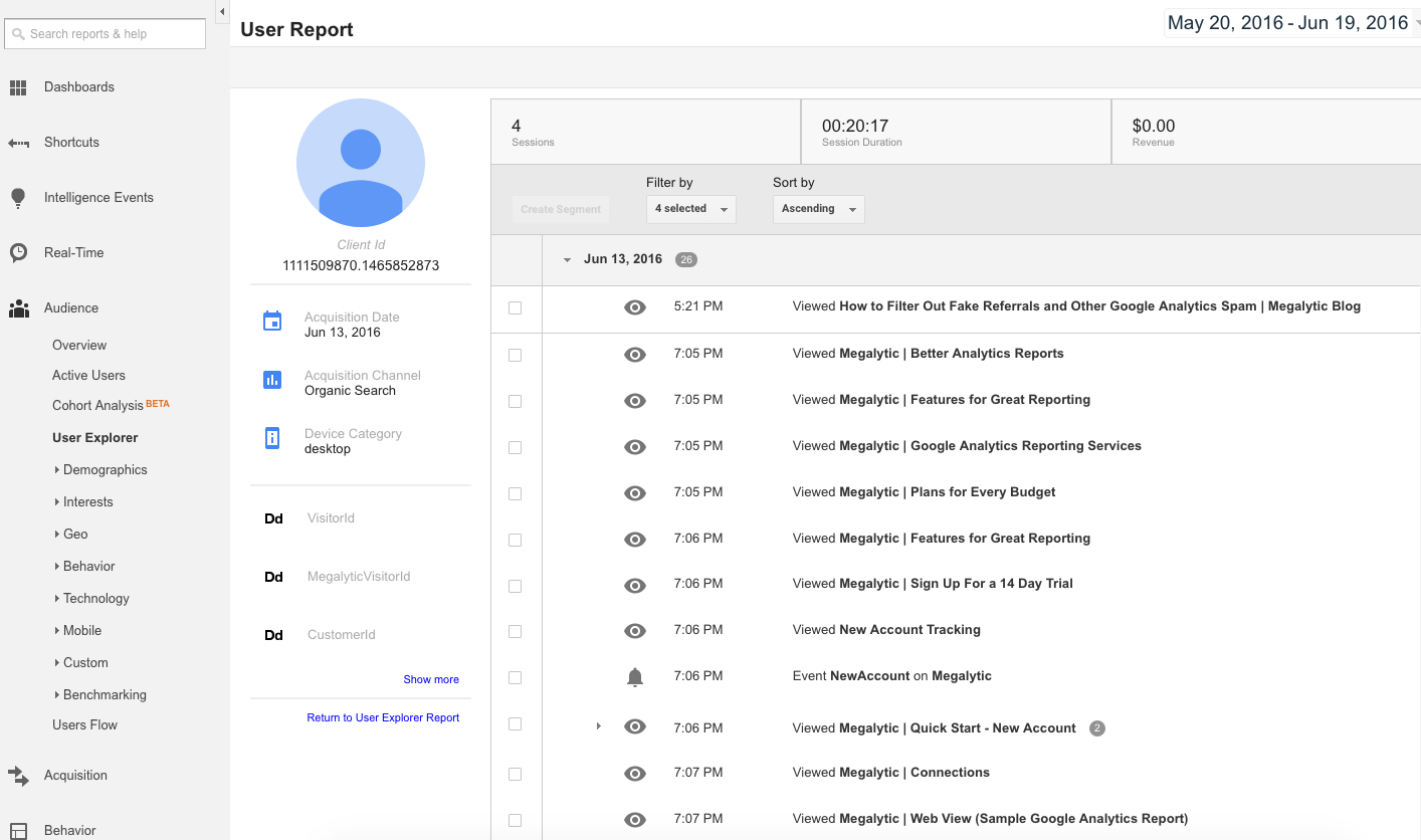 In the example report, we see that this individual initially found the site through a blog post about fake referrals via organic search. Perhaps the blog post inspired the user to want to learn more about the company that authored it. Perhaps they have been looking for a new reporting platform and felt compelled to take action. The exact motivation is harder to discern, but we can see that a couple of hours later, the same person later returned to investigate more about Megalytic This time their journey began on the homepage and progressed through pages about features, services, plans, and other content. Finally, this person signed up for a trial, tracked by the event NewAccount.