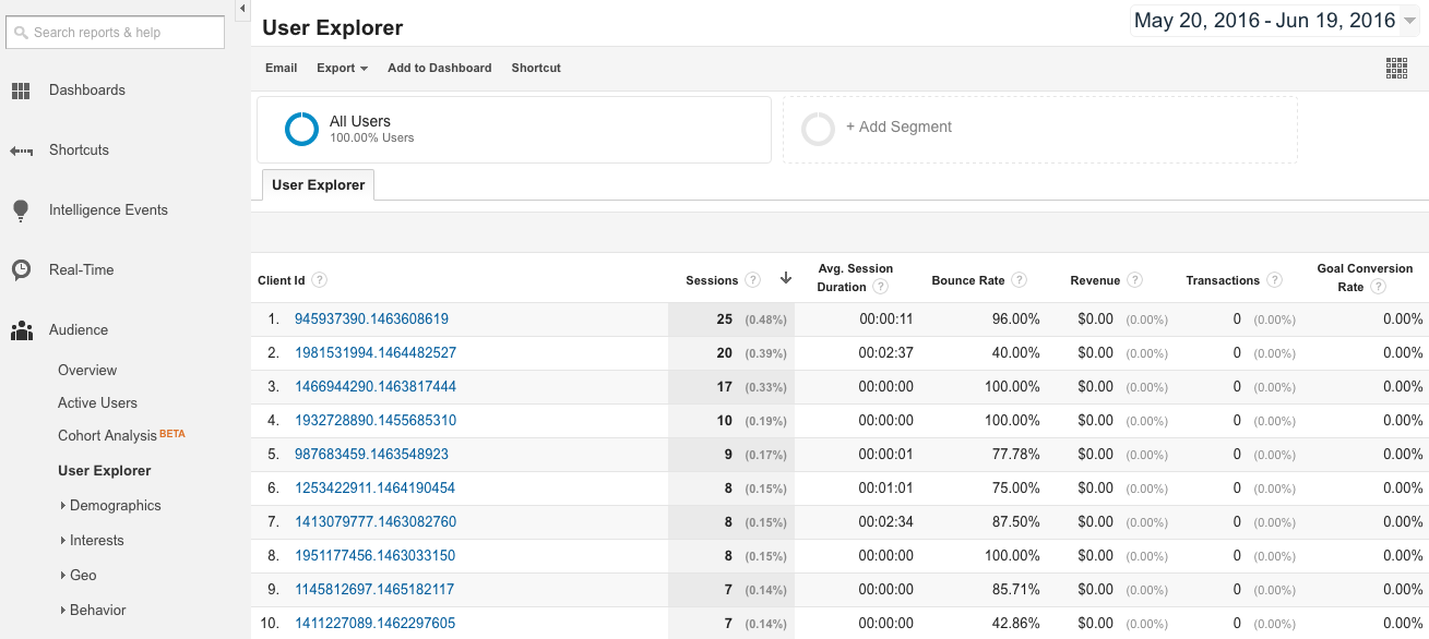 In this report, you’ll see a list of Users who came to your site, with each assigned a Client ID number that correlates to a unique device via which a User engaged with your site. In addition, you’ll see some metrics that correlate with each User, including total Sessions, Avg. Session Duration (average time spent on site per period visiting the site), Bounce Rate, Revenue, Transactions, and Goal Conversion Rate. You’ll need ecommerce tracking in place to measure Revenue and Transaction, as well as either ecommerce or conversion tracking to measure the Goal Conversion Rate.