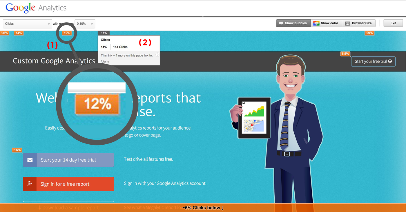 - See the percentage of visitors that click on which parts of the page. Here, we have blown up one of the orange click-percentage boxes to make it easier to read.