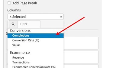 By default, the Completions metric shows the sum of all goal completions. Since we only want to count the New Accounts, we need to select that particular goal completion. To do that, scroll down the list of columns until you reach "Completions." Click on the down arrow to open up the options. Then, select the "New Account" goal. Close the widget editor, and the table now shows stats for the top three campaigns, included the New Accounts.