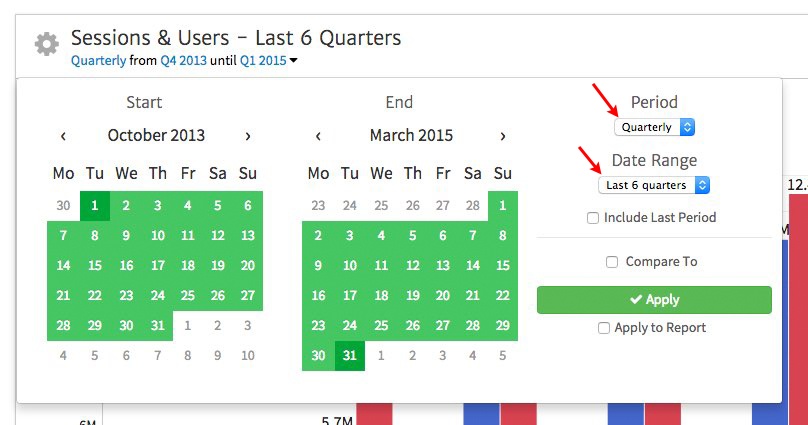 Here, we have intentionally selected a rolling date range - "Last 6 quarters" - so that when the calendar rolls forward into next quarter, the chart will keep pace and always show the most recent 6.