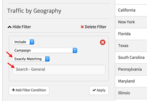 To do that, we can use the Traffic by Geography widget, and we apply a filter to select for each campaign. So, for the first drill-down widget, we use a filter like this to select the "Search - General" campaign.
