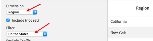 To configure the widget to show data by US State, we select "Region" as the Dimension and in the geographic filter we pick "United States."