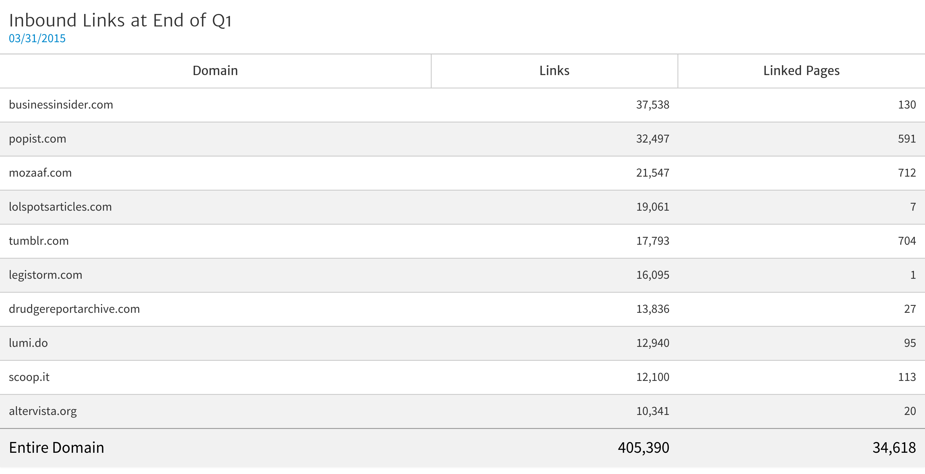 You can also include a summary of where the website's inbound links come from by using Megalytic's Links widget. As with the Search Queries widget, we set the date to March 31 - the end of the previous quarter.