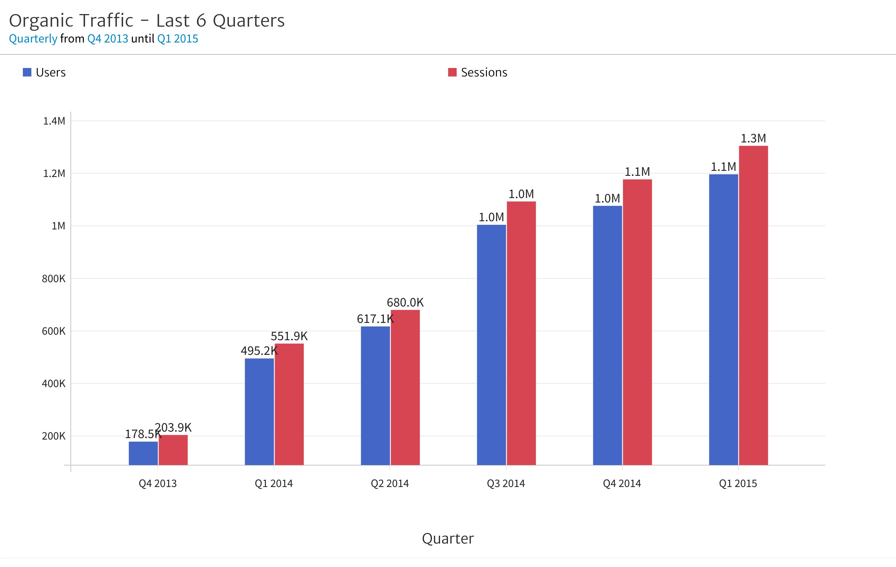 A good place to start is to look at trends. For example, you may begin with a chart like the one below that shows Sessions and Users over the last 6 quarters.